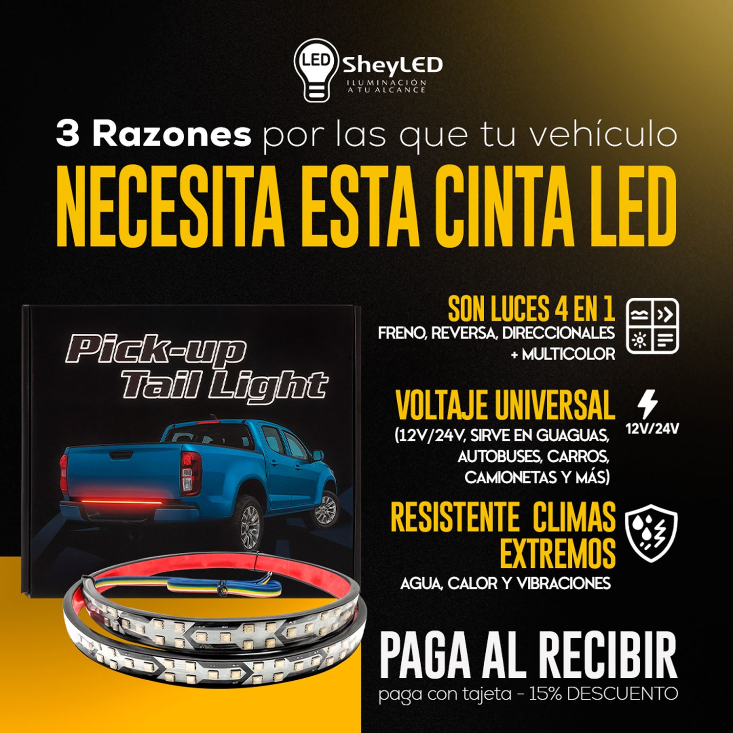 La Cinta LED Multicolor une función, diseño y rendimiento. Su apariencia moderna y su efecto secuencial elevan el estilo de tu vehículo, mientras que sus luces de freno, reversa y direccionales aumentan tu seguridad en cada trayecto.